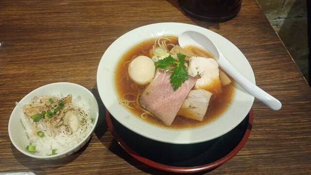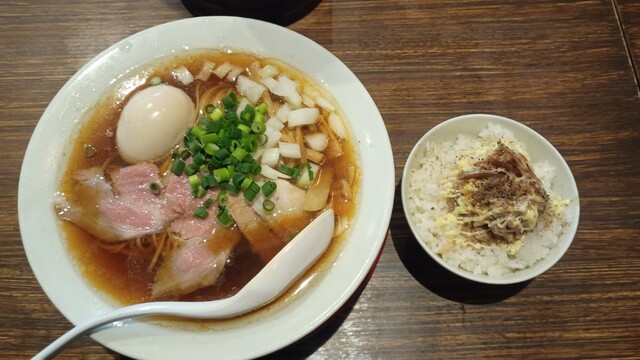 濃・鯛煮干しそば900円(限定麺)+煮卵+ピリ辛鶏皮めし