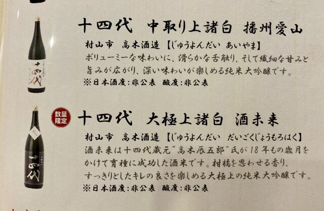 合わせるお酒も厳選され、しかも豊富。メニューに無いお酒も沢山ありそうです。せっかく山形に来たので、十四代をお願いしました。十四代は、上品でバランスが良く、身体にスーッと染み込んで行く感覚の柔らかさ。大好きな日本酒です。