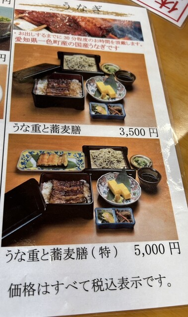 息子現役猟師の鴨そば1800円、オヤジはいつもの天丼セット1600円