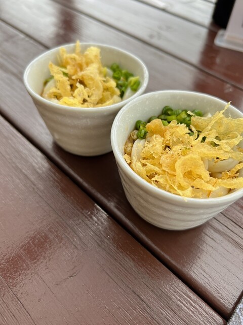 店主さんが丁寧にうどんは18分程お時間頂きますと説明され、川を眺めながら待っていると、サービス?これ食べてまっててねーと2口うどんを持ってきて下さいましたm(_ _)mありがとうございます