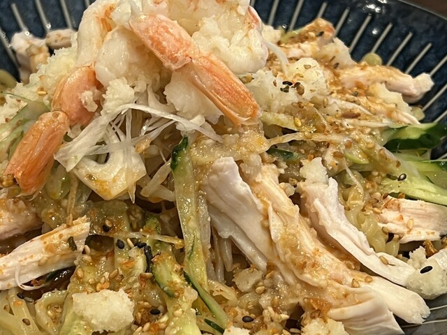 葱、胡瓜、海老、ゴマ等具が多く初めて食べたが絶品の冷やし味噌ラーメンでした!生姜をよく混ぜて冷やしスープよく麺にからませてお食べください。