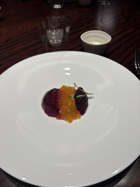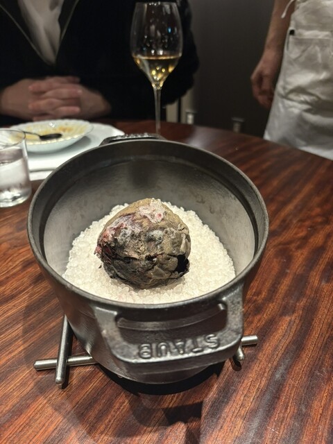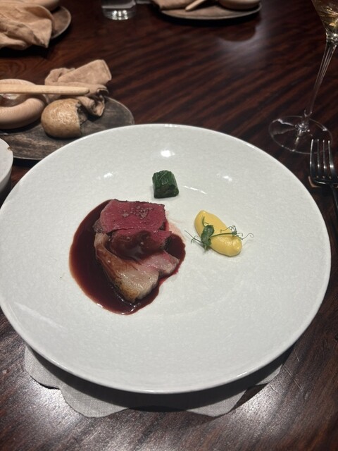 中でもフロマージュブラン使ったお料理が個人的に一番美味しかったです。タルト生地の上に下仁田葱 鮪の頬肉 黒トリュフ そしてオランデーズ風?のソースが合わさり絶品ですね。葱の甘み 鮪の旨み 黒トリュフの香り ソースのコクがマッチして余韻ある逸品でした。