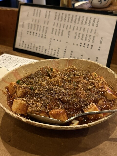 美味しいジビエを食べたくて2人で入ったのですが、この日は羊と鹿でした。悩んだ末に、ラム肉にしたところ、これが大当たり!臭みがなく柔らかい肉質で新鮮そのもの。久々に美味しいラム肉を食べました。これが満足その1。他にいろいろと美味しい惣菜をいくつも頼んだところで、麻婆豆腐を注文。山椒が効いていてお店特製のとっても美味しい麻婆豆腐でした。これはオススメです。これが満足その2。次は魚をと思っていたら金目鯛があったので、「素揚げは珍しいですよ、出しましょうか?」との店主の言葉に乗っかって、金目鯛まるまる一匹の素揚げを注文。これがまた良かった!表面はカリカリ、サクサクで、中身はふあふあ。素揚げなので、背骨以外は全部食べることができました。金目鯛の素揚げは初体験でありました。最高でした。これが満足その3。お酒もそれぞれに合うものということで、麦焼酎、芋焼酎、赤ワインなどを勧められたりしながら堪能しました。これが満足その4でした。とにかく、全部がとても質が高く美味しかったです。2人でまた来ようと約束しました。
