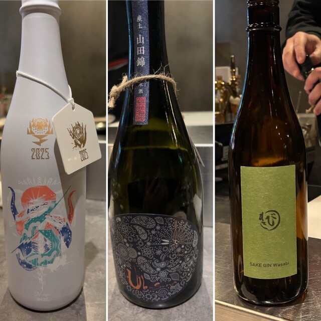 ドリンクは、このお店でハマってしまった自家製コーラを使ったラムコークでスタート。その色に驚かれて、隣席の皆様も飲まれていました。その後は、相変わらず素晴らしい日本酒のラインナップ。みむろ杉の巳年限定酒、新政のNew Year Type、産土の飲み比べなど本当に貴重なお酒ばかりです。また、チェイサー代わりに飲むジントニックやジンソーダ。贅沢の極みですね。