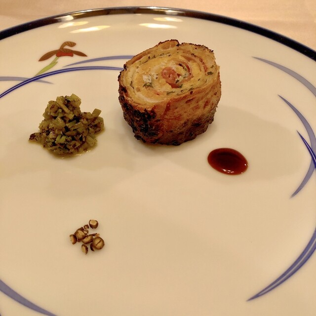 フィレにされた鮎は黒トリュフ、肝のペーストでくるみカダイフに、日本の川魚の代表的な鮎を見事にイタリアンに仕立てた一品、ほんのりした控え目な肝の香りとさっと現れるような黒トリュフの濃厚な香り、シェフの独創性がひかる一品
