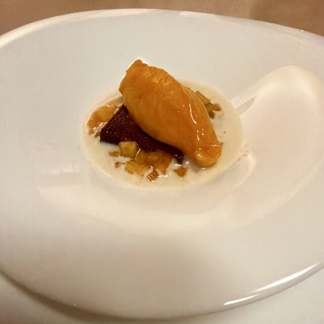 ホタテの出汁をたっぷりと含み海の香りの濃厚なデシャメルソース、加熱されたウニの深みと生のウニの甘味に絡めていただく