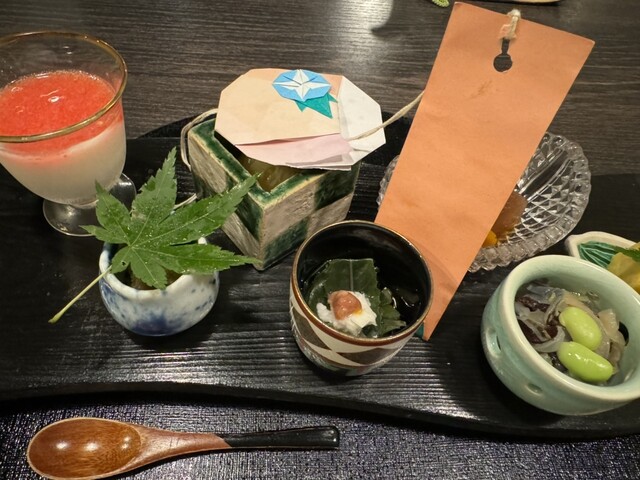 3人でランチを予約。駅近くだが、見過ごしてしまいそうな小さなお店。入ると、お茶を出してくれ、ホッとひと息。一口サイズの物がたくさん出てきた。七夕をイメージした料理だった。とうもろこしのスープ仕立てや鮎の塩焼き、刺身などどれもよかった。最後にサービスで抹茶と黒糖アイスも…大満足❗️
