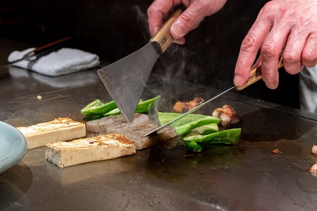 焼き物はすべてシェフが目の前の鉄板で焼いてくれます。神戸ビーフは但馬牛の中でもランクの高い部位をそう呼ぶみたいです。今回は但馬牛との呼称のランクでしたが、普段外国産の牛肉を食べている身としては十分美味しく感じます。肉のランクも関係するかもしれませんが、焼き加減やカットの仕方などシェフの手腕が一番味に直結するのではないかと感じました。