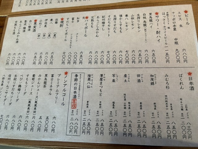 月曜日の18時に初訪問。直前に電話予約したら「(真ん中の大テーブルの席で)横並びなら」と確保してもらえました。コースか迷いつつ、日本酒を好きなの試したかったので今回はアラカルトへ。