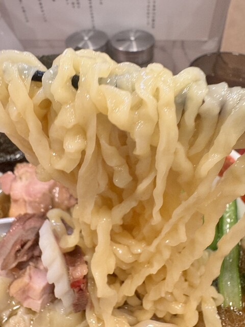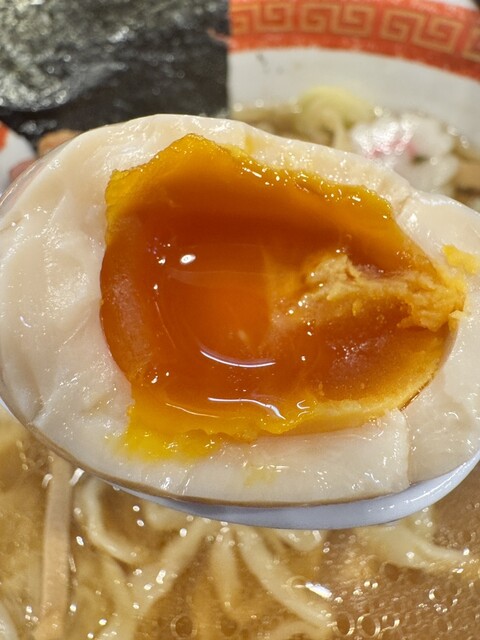 海苔3枚、豚と鳥のチャーシュー、なると、ねぎ、シナチク、そして後から出てきた半熟煮卵、青物はおそらく小松菜