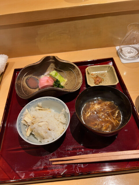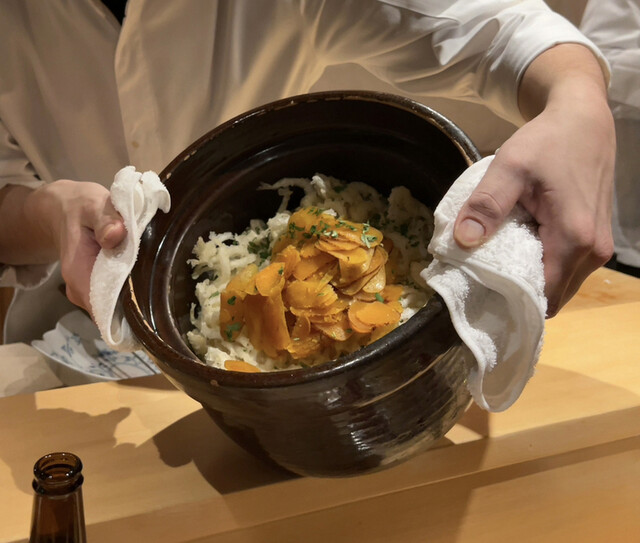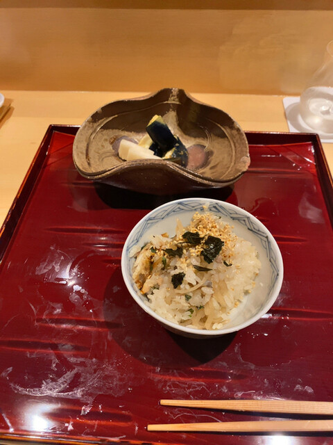 白魚と百合根のかき揚げと唐墨のご飯