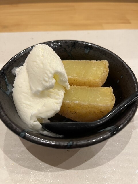 最後にかき揚げ天丼も香ばしくて良かったし、デザートもさつまいもを何度も徐々に塩味で揚げて、それを甘いバニラアイスクリームで食べる…。