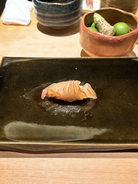握りはサバ、金目鯛、シマアジ…と続き、合間におすすめの日本酒を半合ずついただきます。