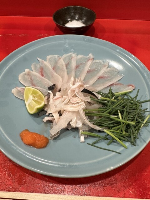 (天然虎河豚の白子。クリーミーで、そのまま食べても塩、ポン酢をかけても最高の味。半分残してしてシャリを投入。シャリと混ぜたら軽く塩を…最高の白子リゾットになります!これも最高に美味しい!)