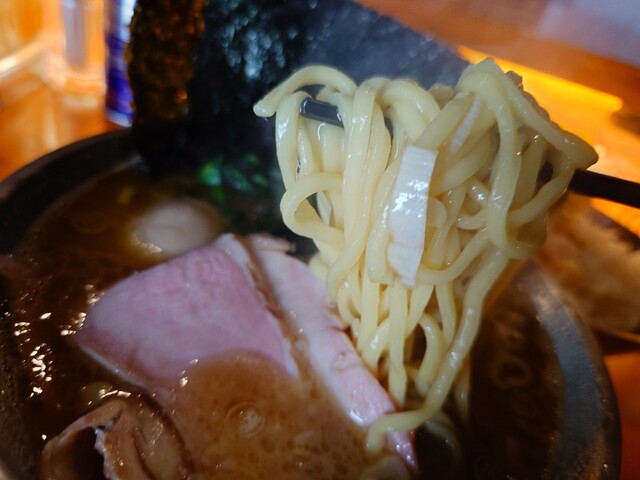 麺量は多めで歯ごたえもいい。大ぶりチャーシュー2枚が食べごたえあり。