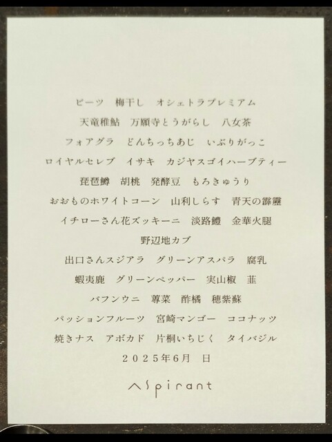 .....⑥おおものホワイトコーン 山利しらすペースト 青天の霹靂のリゾット サマートリュフ.....④パッション烏龍茶 とうもろこし茶 はちみつ 醤油麹 カラマンシービネガー.....