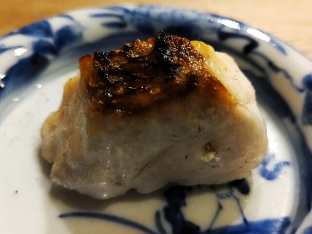 .....三品目 明石の天然鯛 薪焼き 鯛の出汁を減圧浸透しているので一口で.....
