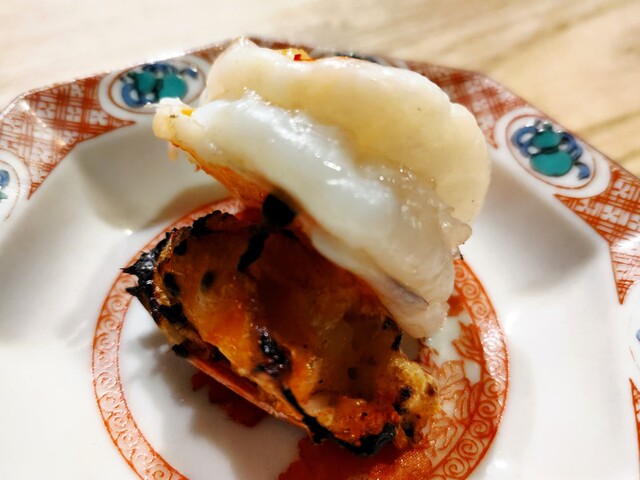 .....二品目 オホーツク海のホタテ貝柱 減圧浸透 薪焼き すじ青海苔.....