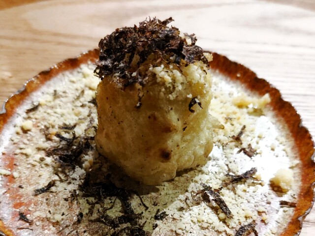 .....六品目 北海道の2年熟成のメークイン さらに熟成して蒸して揚げて 酒粕 チーズ 黒トリュフ.....
