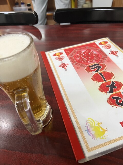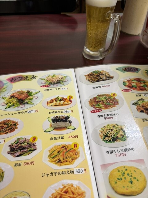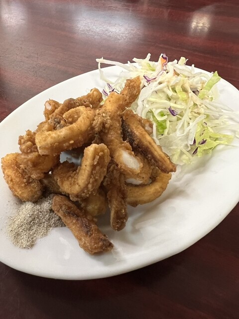 ビールセットで、イカゲソ唐揚げと野菜炒めをチョイス。その後は悩んだ結果、豚肉生姜焼きをいただきました。