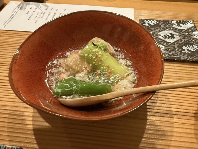煮物椀。菊の節句近くにふさわしい華やかな椀。かます、舞茸、玉子豆腐など。