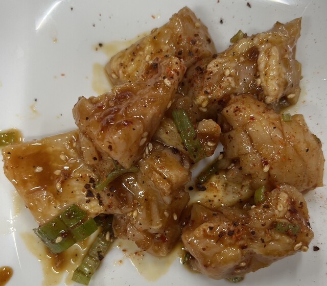 キムチ(700円)、カクテキ(700円)、牛すじの大根煮込み(1,000円)、ハツのタタキ(250円×3)、牛もつ味噌煮込み(1,300円)、コムタンスープ(1,500円)、上タン(2,800円)、特上ハラミ(2,700円)、ミスジ(3200円×1.5人前)、並赤身(1,800円)、上ミノ(1,800円)、レバ塩(1,800円)、ミックスホルモン(2,700円)、杏仁豆腐(650円)をシェアで頂きました。お腹がはち切れそうなくらいいっぱい食べ、お酒含め1人約1万円でした。美味しく、コスパも良く大満足です。