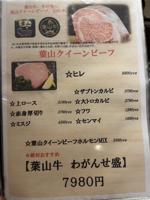 葉山牛盛り合わせは、様々な部位を少しずつ味わえる贅沢な一品でした。葉山牛クイーンビーフホルモンは、他では味わえない個体識別番号を終える超希少なホルモンで、ホルモンの旨みと味噌ベースのタレとの相性も抜群でした。