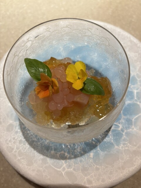 キャビアの入れ物もデコられてキュートでキャビアの下にユッケが敷かれている。食用花が散りばめられてみて楽しめる遊び心詰まったもはや食べる作品でした笑