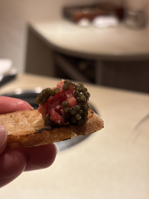 まず、アミューズの「ユッケとキャビア」。新鮮なユッケの甘みと、キャビアの塩気が口の中でとろけ合い、贅沢な幕開け。
