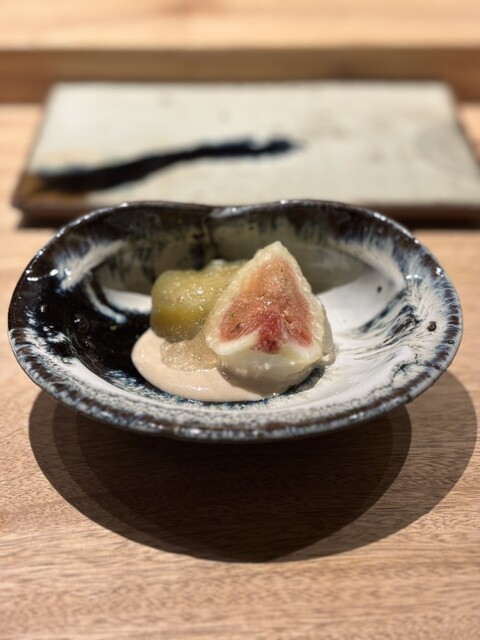 まず先付けの羽曳野いちじくと焼きなす、味付けはごまのクリームソースとお出汁のジュレ。いちじくの優しい甘みと焼きなすの香ばしさ、そして濃厚なごまクリームが絶妙に調和し、最初の一品から心を掴まれました。