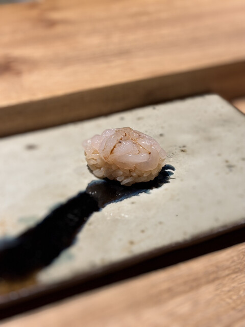 続いて白甘鯛の氷温熟成(4日目)。ねっとりとした食感と、噛むほどに広がっていく上品なほのかな甘みが感じれました。三重県答志島トロサワラ、脂の乗りが抜群。そして、白甘鯛の炭火焼きは、皮目が軽くパリッと香ばしく、身はふっくらと仕上がっており、絶妙な焼き加減。
