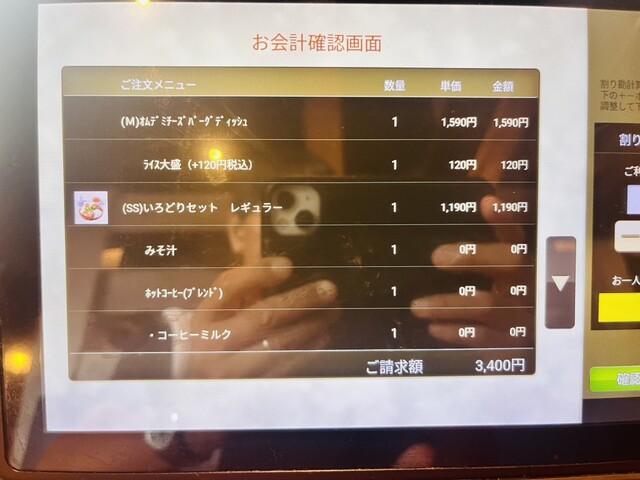 私は、オムデミチーズバーグデニッシュご飯大盛りとお味噌汁、アイスコーヒー、嫁さんは、いろどりセットと、