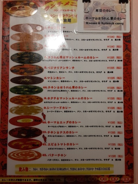 ランチメニューは、選べるカレー + 本日のカレー + ナン&サフラン食べ放題 + サラダ + ドリンク