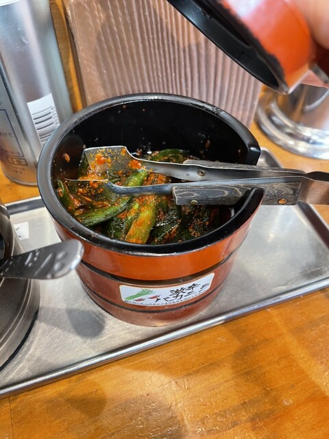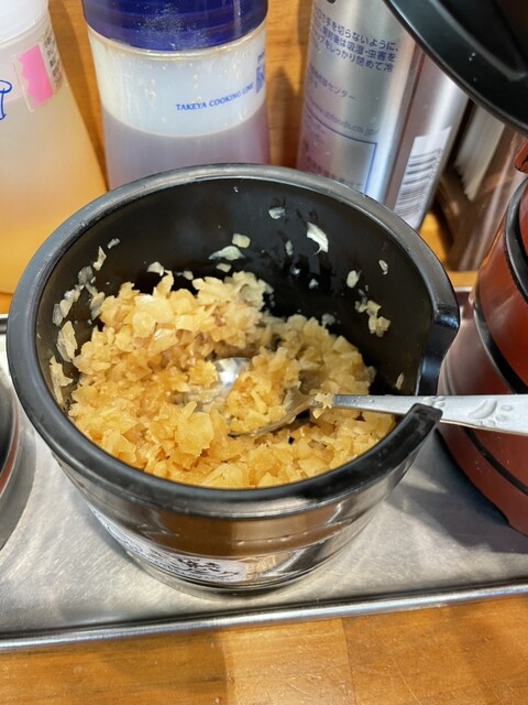 ニラ、キクラゲ、ニンニクの醤油漬けは味変アイテムとして卓上に置いてある