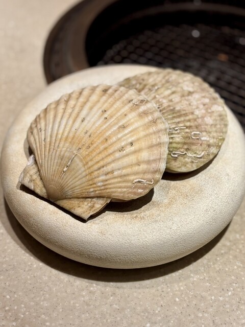 目の前で捌かれる新鮮な帆立は粘り気の強い大和芋