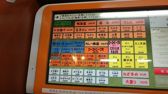 天玉は「かき揚げそば480円+生玉子100円」の複合で食券を購入する。