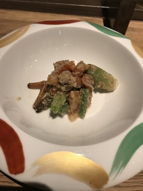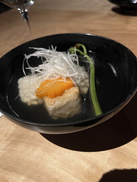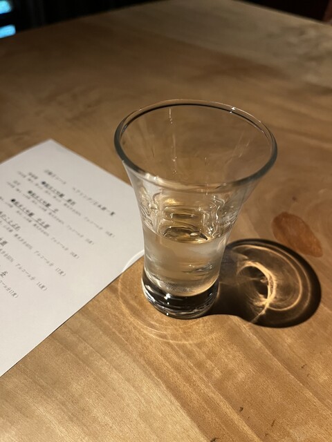 扉を入って予約名を告げると奥のテーブル席に通された。あれ?カウンターでお願いしたのにと思いつつ、既に小さなカウンターには先客がいたので何も言わずにテーブル席で我慢した。美しい酒瓶を見たり、店員の方と話したりできるカウンターが良かったのだが、以前もコースだとカウンターは狭いが良いか?と確認されたので、逆に気を使ってもらったのかもしれない。ただ、変更するならば一言欲しかった。料理、酒類の提供時も暖かい感じの言葉はやや薄れ、バイトさん感覚の接し方になっていたかと思う。ここら辺はちょっと残念。