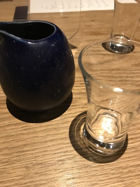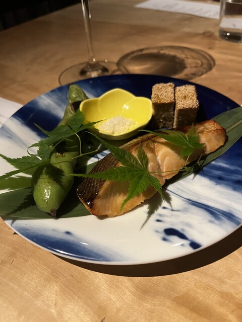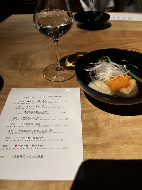 レストランスペースとバースペースで分かれているようで今回はバースペースの2F席に通された。2F席のテーブルは二つだけなので落ち着いて話が出来る。ただカウンターも美しく日本酒が並べられているので楽しそうだ。次の機会があれば使ってみたい。