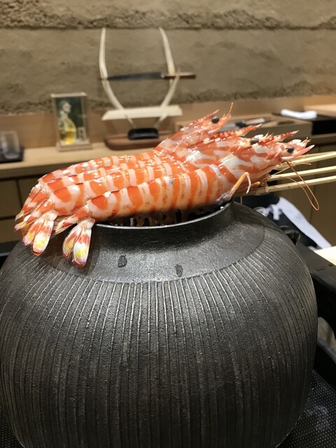 海老の色と九谷焼とのコラボも面白い。中は柔らかく殻はパリパリと香ばしい。