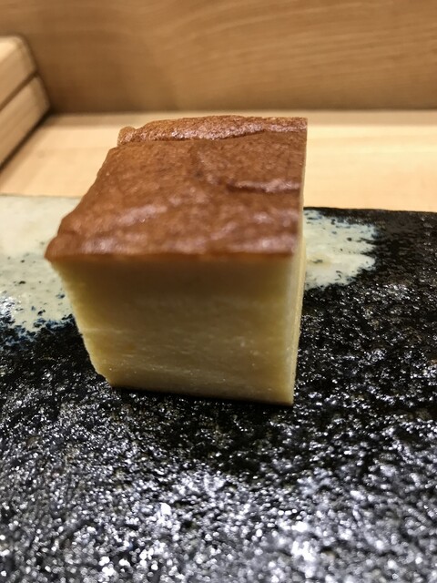 ネタ鮨はげたの中央に置かれるが玉は隅に置かれる。甘みが抑えられ玉子そのものを味わえる。