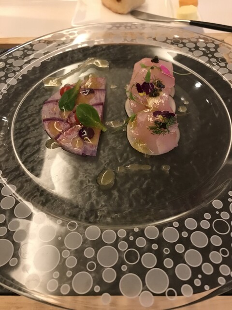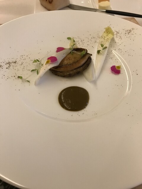 オードヴルは3品もあったので一皿でまとめて提供されると思いきや一皿ずつ提供された。手間だろう。そして洒落た皿に盛られた各一皿でも満足しそうな皿達。アワビは小ぶりながらも旨みが閉じこもったソテーにアンディーブ=チコリの苦みがいい。尾長鯛もいいが、黒大根と京大根の鮮やかな色合いと酸味のある木苺のソースをまとったさっぱりとした味わいが旨い。中でも伊豆メディカルの野菜が最高。菜園風というサブネーミングもバッチリ合った盛り付けと皿。瑞々しいキノコたちの味をダイレクトに楽しめる。