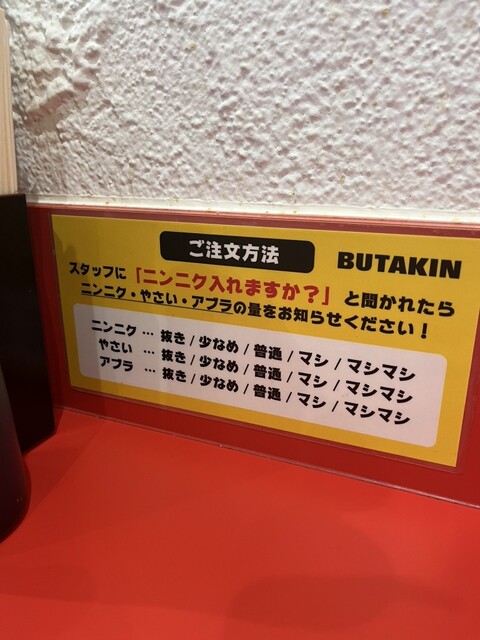 入口で食券を購入し、着席後にニンニク、やさい、アブラの量をスタッフさんに伝えるシステムです。選択肢は抜き/少なめ/普通/マシ/マシマシの5段階で、今回はすべて普通でお願いしました。ほどなくして着丼した小ラーメンは、圧巻のビジュアルで、見るだけで背徳感が溢れます!全然小ではないです!笑