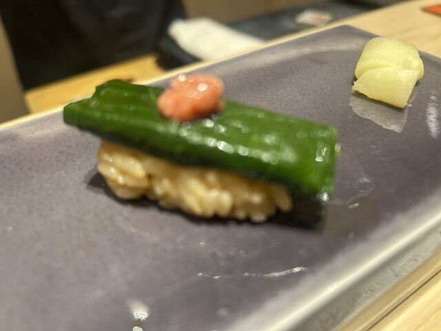 珍しく椎茸とイクラの握り、椎茸を噛むと同時にイクラの粒が割れ、絡み美味しい