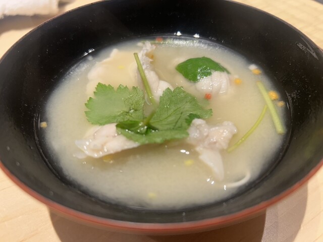 先付オマール海老から取った出汁のあら汁ですが、海老風味が強く美味しい