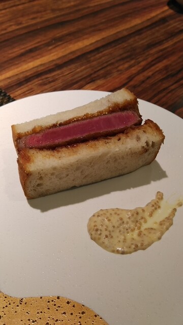 続いてブリかつサンド。レアなかつのめちゃくちゃ色っぽいピンク色にウットリ♪これを大阪から取り寄せたパンでサンド。ソースで味付けされていますが味変用にマスタードマヨネーズが用意され、いざ実食。柔らかな食感に思わずニヤついてしまいます。マスタードマヨネーズの味変もグッド!酸味と辛味がマッチして大満足。