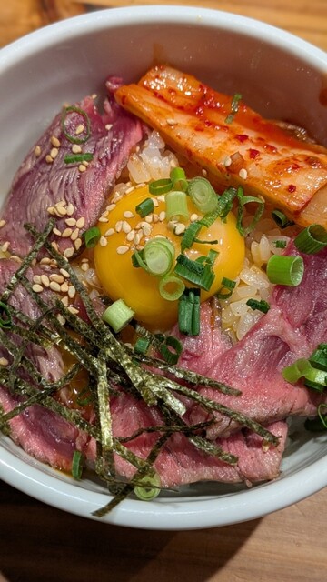 赤壁のローストビーフ、卵黄、キムチをのせたミニ丼で、旨味がぎゅっと詰まった贅沢な締めご飯