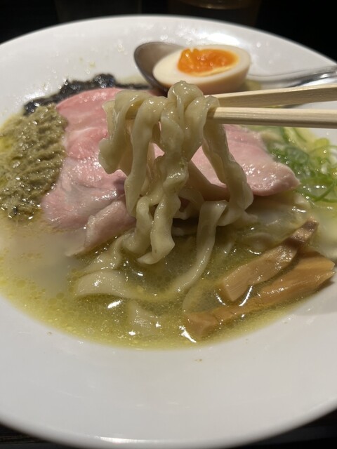 皆さんの写真通りの姿で着丼。でも味は予想を超えてきました。まずスープ。貝の味に深みがあって、思わず美味いと声が出ます。牡蠣ペーストを徐々に溶かし、最後はぶどう山椒を振りかけて、味わい尽くします。そして、太ちぢれ麺。硬めのうどんにも似た食感で、食べ進めるとともに満足感がピピピピっと上がっていきます。