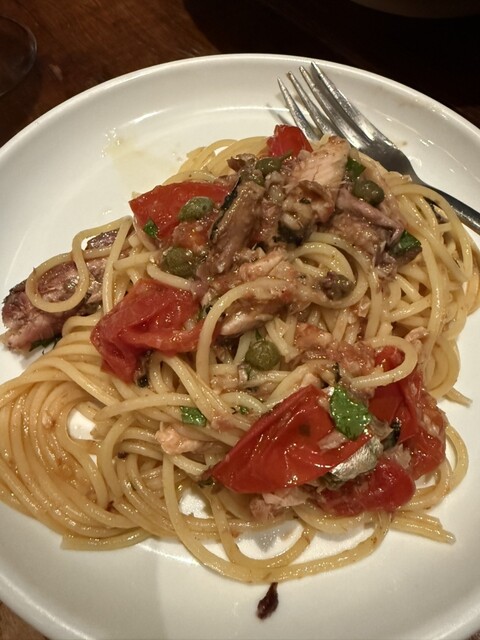 お茶した後だったので、腹ペコではなかったのですが、店長にお薦めのワインと札幌のモッツァレラのカプレーゼ、それからKNOCKと言えばのオリジナルパスタ2品。秋刀魚は5時間かけてコンフィしているそうで骨まで柔らかく、これまでで最高の1品。比較的あっさりしているという馬肉と牛蒡のボロネーゼで締めました。ワインも美味しく、大満足でした。