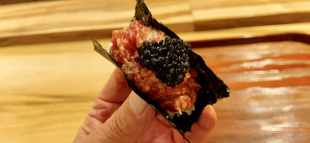 ユッケ風磯部巻き キャビア添えも旨し。