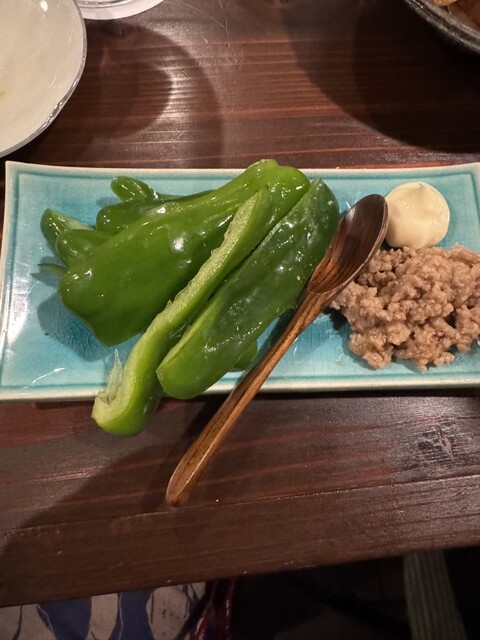 ピーマンってこんなにパリパリになるんだ❗️と女店主と方法をお聞きして盛り上がる。肉味噌乗せて食べると、パリパリ、シャキシャキで生ピーマンが甘い❗️